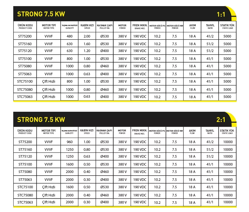 Kolay MontajGüçlü ve HafifEnerji TasarrufuYüksek PerformansKapasite 480-1000 kgHız /2.0ms - 0.63msMT.Tip / VVVF-Çift HızMT.kW / 7.5kWStatik Yük 5000kgYag Dolumu ... Devamı